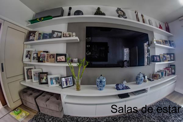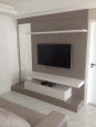 Painel TV em mdf Areia e Gianduia Cristallo, tons suaves para essa linda sala. Conta também com um espaçoso e moderno rack.